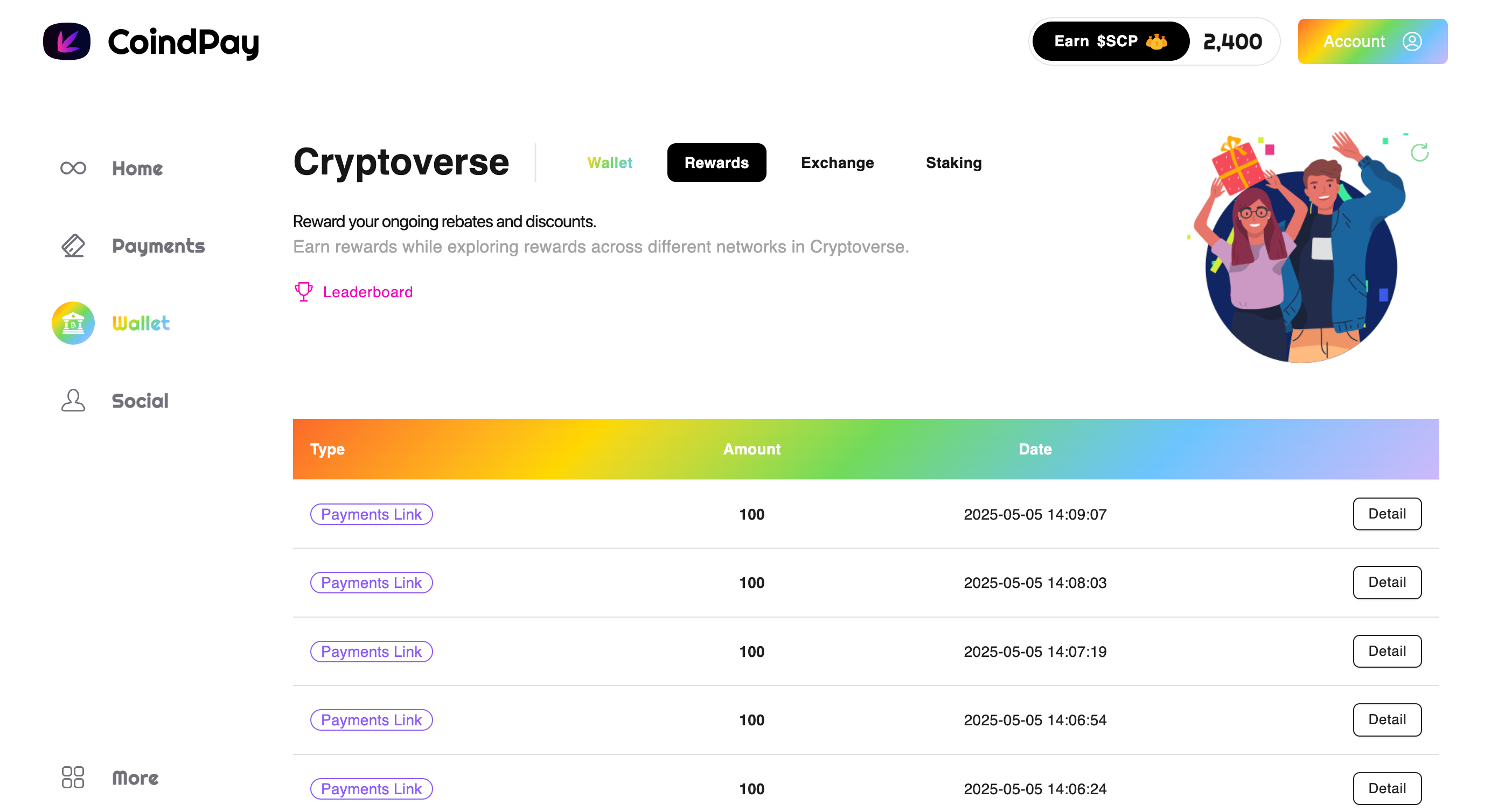 | <h4>Invite Friends</h4><p>One-time reward for invitees completing their first payment of $100 or more.</p> | <p></p><p>200（Per user） $SCP</p> | Invite  |